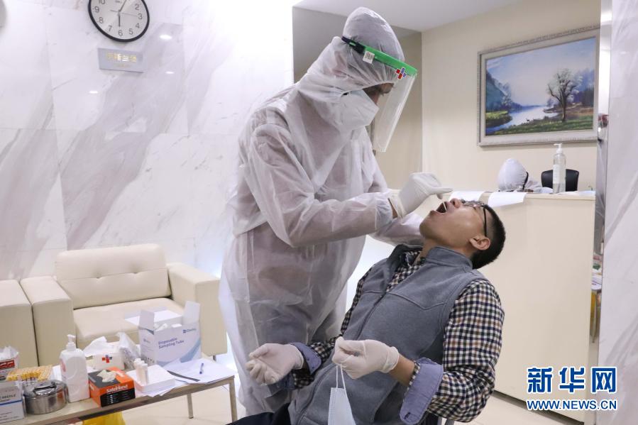 1月23日,醫務人員在巴基斯坦薩希瓦爾燃煤電站內為一名準備進場的電站員工進行新冠病毒檢測取樣。新華社記者 李浩 攝